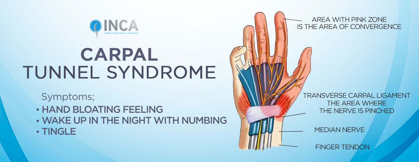 The symptoms of carpal tunnel syndrome typically develop gradually. An important indication of carpal tunnel syndrome is when numbness and tingling do not affect the little finger. Intermittent sensations of electric shock accompanying numbness in the first three fingers may also be present
